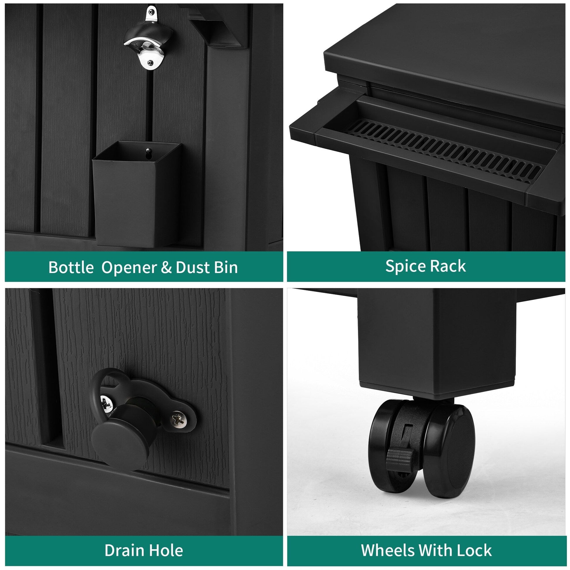 GRANDE CAPACITÉ - Ce chariot de glacière de patio est livré avec un seau à glace de 85 pintes/21 gallons et un espace de rangement ouvert pour refroidir vos boissons pendant des heures.ACCESSOIRES MULTIFONCTIONNELS - Comprend des conceptions distinctes polyvalentes, y compris un décapsuleur, une poubelle assortie, un support à épices et un espace de rangement inférieur pour plus de commodité, ainsi que le sac de glace en PVC avec des trous de drainage pour remplacer facilement l'eau ou les glaçons.ROULETTES VERROUILLABLES - La glacière à roulettes bénéficie de 4 rouleaux multidirectionnels, dont 2 sont verrouillables pour maintenir la glacière en place pour une stabilité supplémentaire sur des surfaces inégales.ASSEMBLAGE RAPIDE - Ce chariot à boissons d'extérieur est fabriqué à partir de résine recyclable et durable pour un entretien facile ; Suivez simplement les instructions incluses pour une installation facile.MATÉRIAUX DE QUALITÉ SUPÉRIEURE - Nos chariots de glacière à roulettes sont construits en résine résistante aux intempéries avec une texture de bois naturel pour une grande durabilité, une protection contre le pelage et les bosses, un look élégant et un toucher minimal.