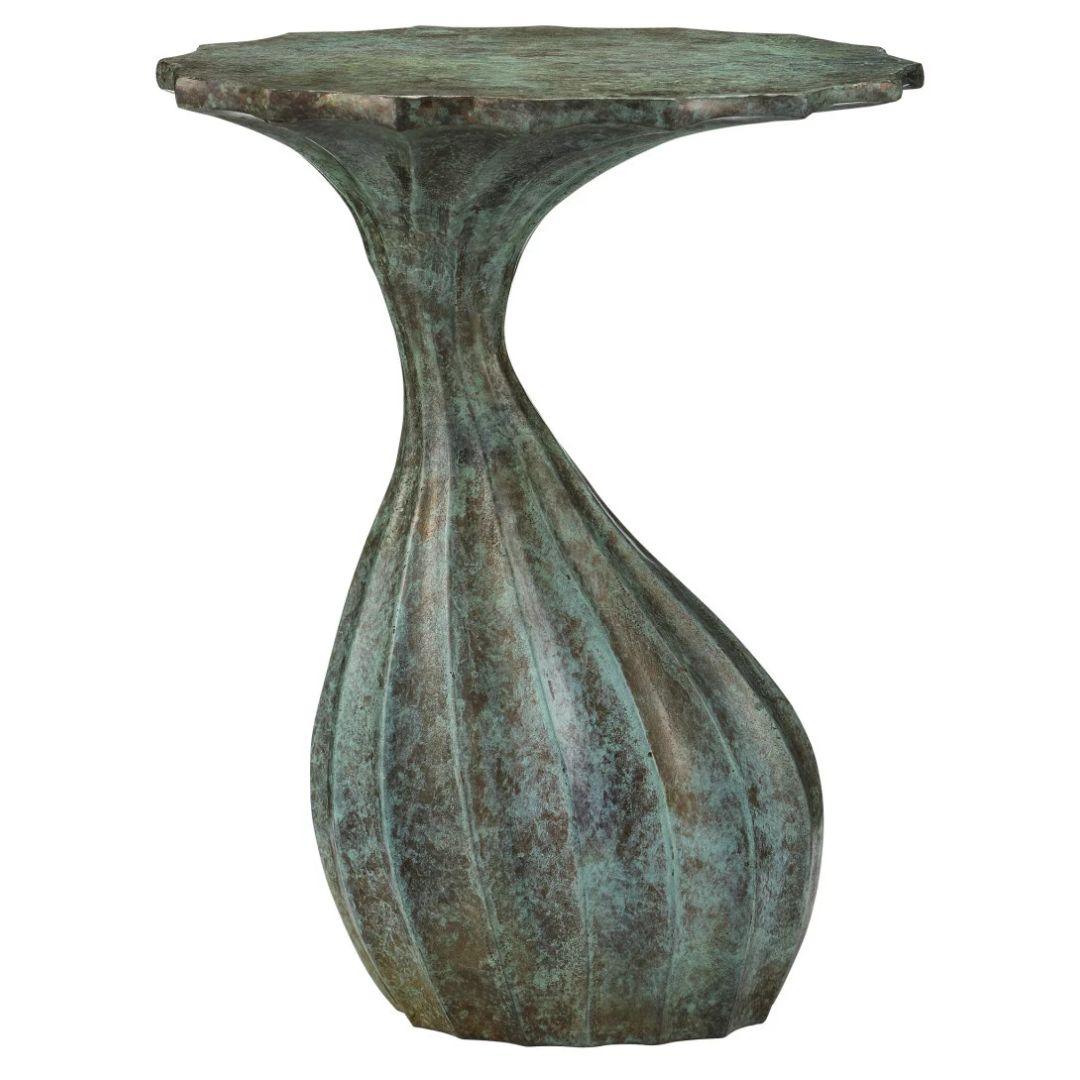 Cette luxueuse table d'appoint artisanale Vert-de-gris est fabriquée avec expertise en aluminium moulé et arbore une superbe finition imitation vert-de-gris. Ses surfaces fluides et marbrées dégagent un éclat subtil, jusqu'au magnifique plateau. Le travail artisanal de cet artisan se reflète dans les riches variations de tons, sublimées par des reliefs et des creux.