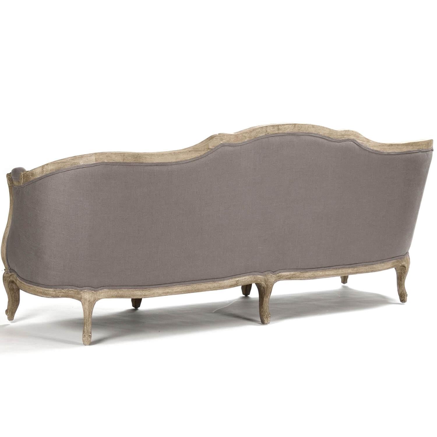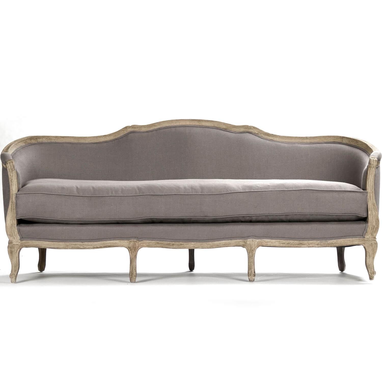 Long et élancé, ce canapé gris français présente une structure en bois aux détails soignés qui entoure le dossier ferme et le coussin d'assise unique rembourré de duvet. Une finition délavée met en valeur les pieds et la structure sculptés, tandis que le passepoil apporte une touche finale au revêtement neutre. Installez ce canapé chic dans toute pièce où vous recherchez un confort optimal.