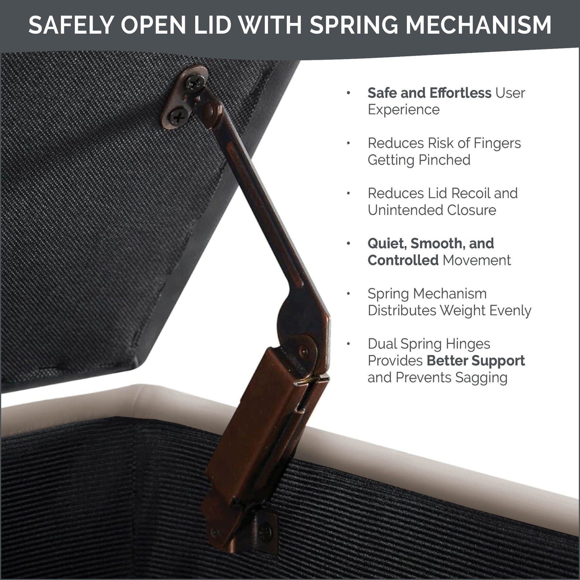 - Construction de qualité avec couvercle et côtés rembourrés, pieds en bois massif et mouvement silencieux, fluide et contrôlé à l'aide de charnières à ressort