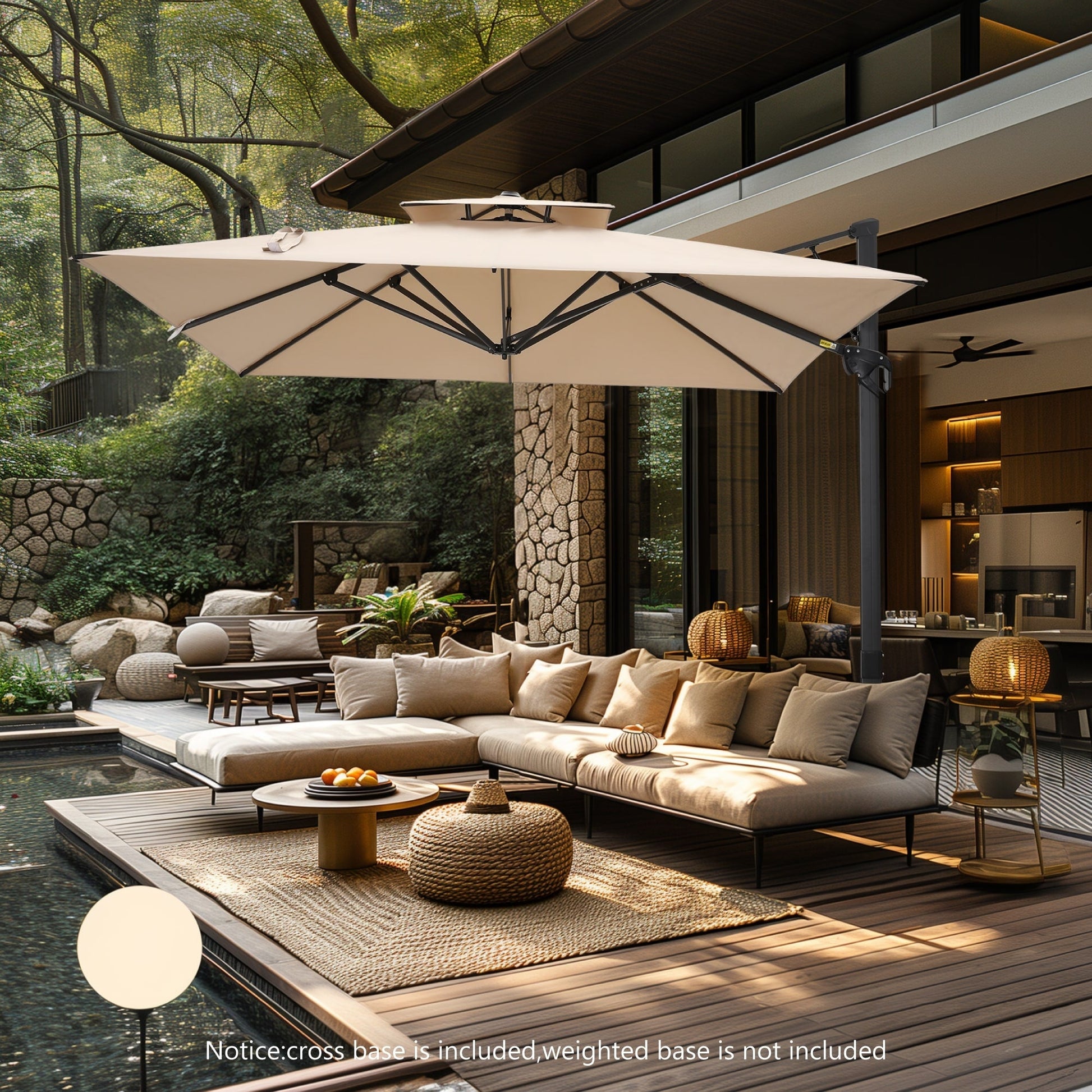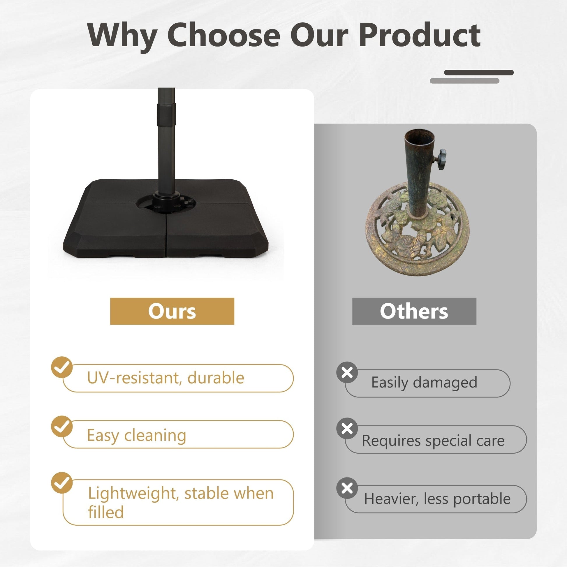 • Veuillez noter que tous les parapluies comprennent une base croisée et vous pouvez choisir de l'acheter avec une base lestée ou non.