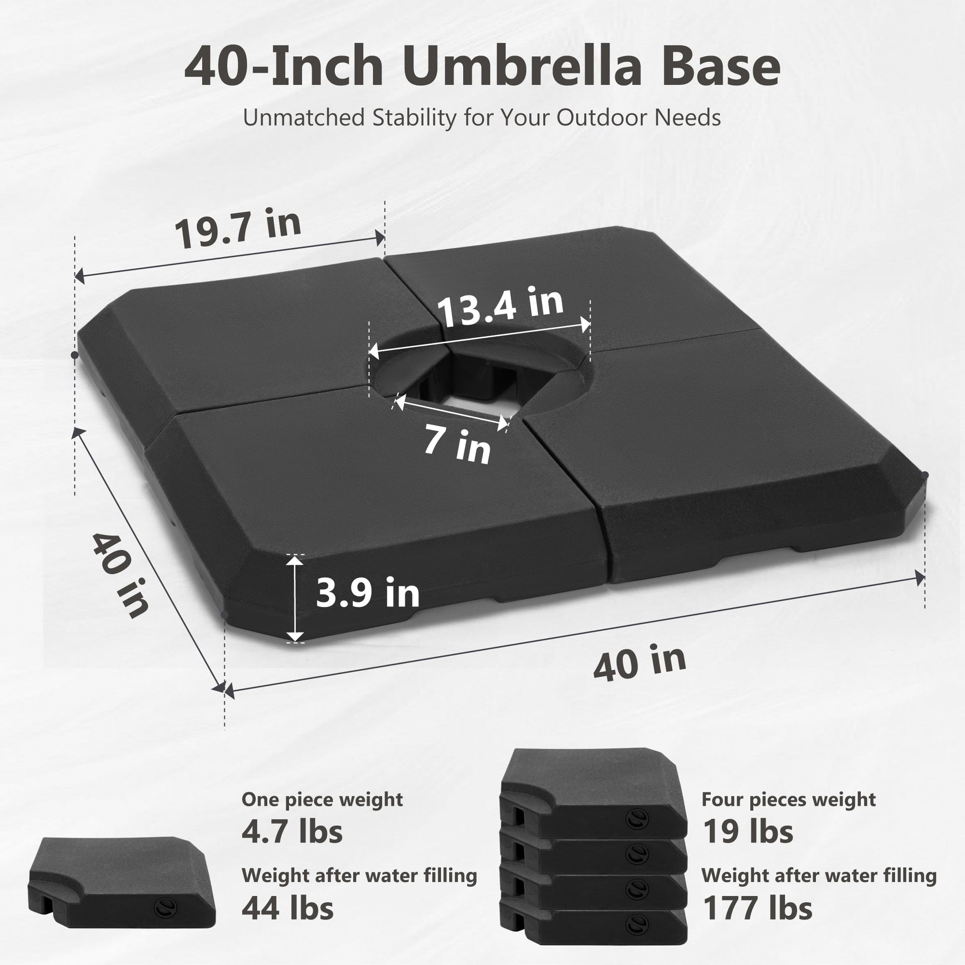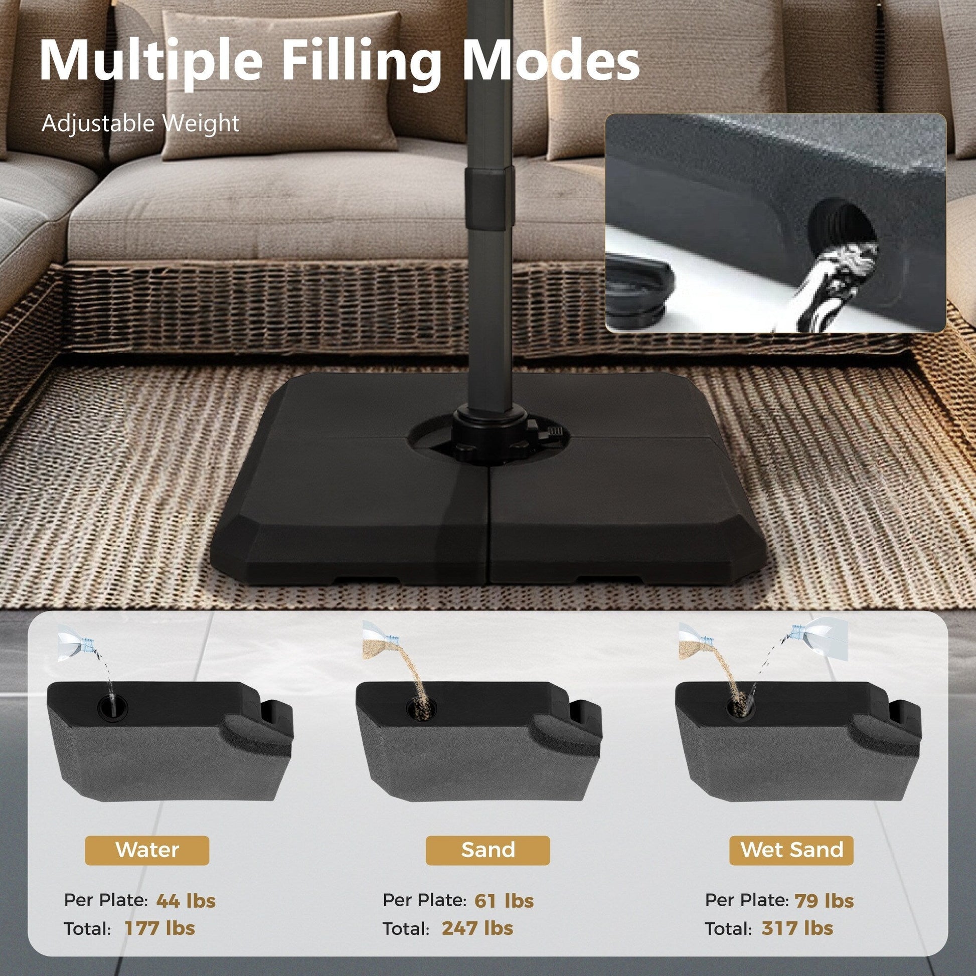 Remarque : Pour le poids, nous recommandons un socle en 4 parties d'au moins 30 kg chacune, pour un total de 120 kg. Pour votre sécurité et éviter tout dommage inutile, veuillez maintenir le parasol fermé et sécurisé lorsqu'il est exposé à un vent fort ou lorsqu'il n'est pas utilisé.
