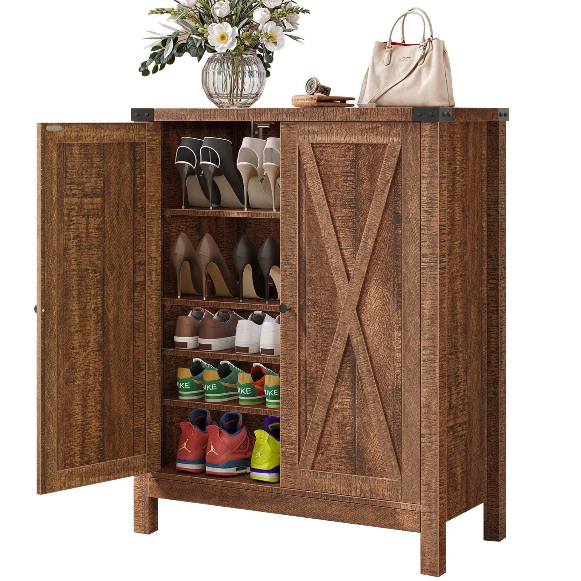 Organisez votre espace avec notre spacieux meuble à chaussures. Avec ses 5 étagères pouvant accueillir 15 à 20 paires de chaussures et son plateau pratique pour les petits objets, il est indispensable à toute maison. Son élégant motif en X lui confère un charme rustique, tandis que ses 1re et 3e étagères réglables accueillent tous types de chaussures. Fabriqué en MDF durable avec des pieds en bois robustes, il est conçu pour une stabilité et une longévité accrues. N'oubliez pas d'installer le kit anti-basculement inclus pour plus de sécurité.