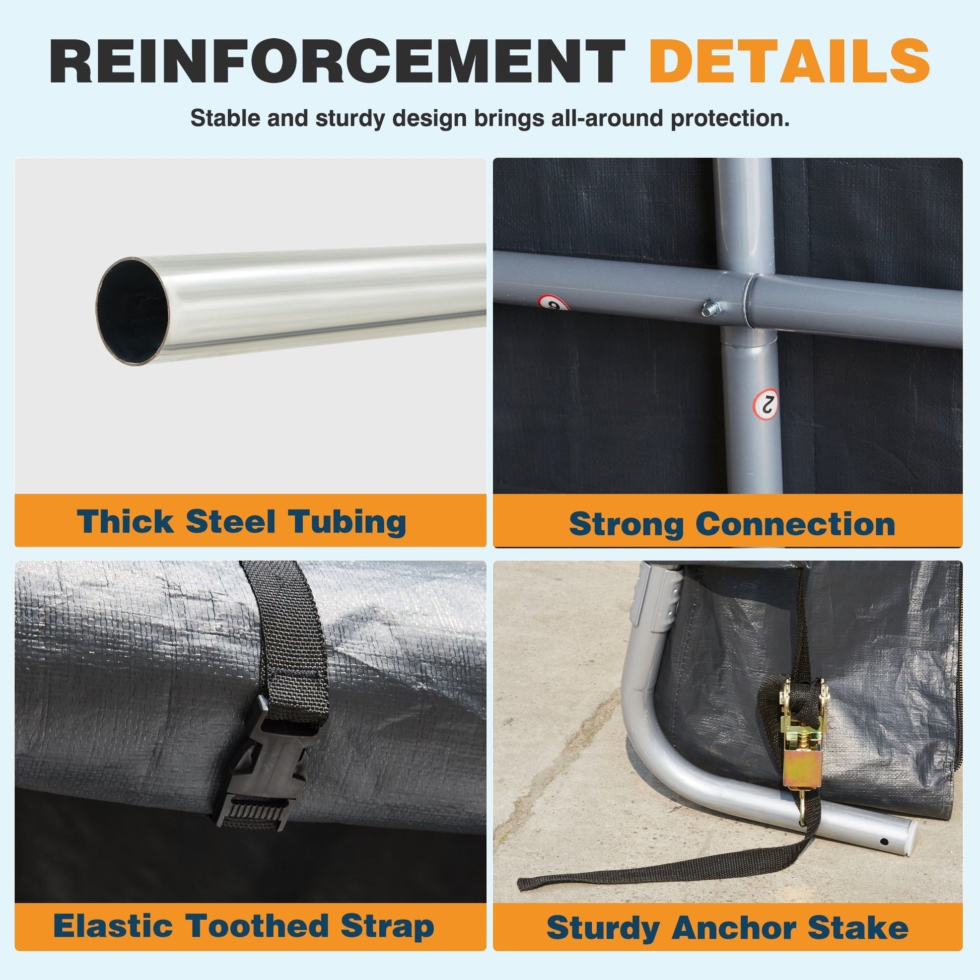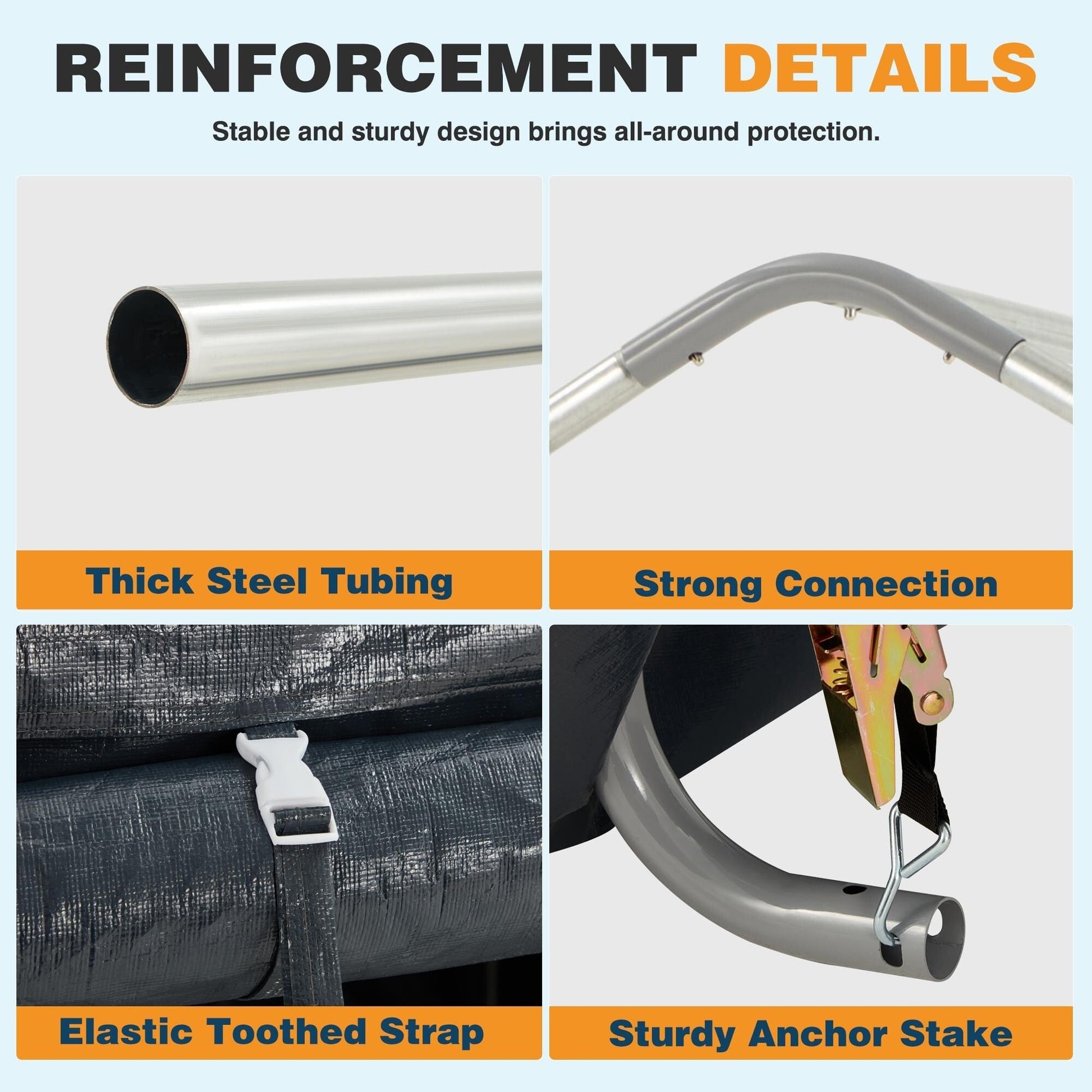 - Conception stable et durable : tube en acier épais, sangle élastique crantée, piquet d'ancrage robuste et connecteur à 4 voies pour une stabilité et une sécurité accrues. La porte à double fermeture éclair est pratique.